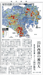 東京都の新たな地震被害想定が発表された。東京湾北部地震(冬18時)の焼失棟数分布図に地図を重ねてみた。(左上)